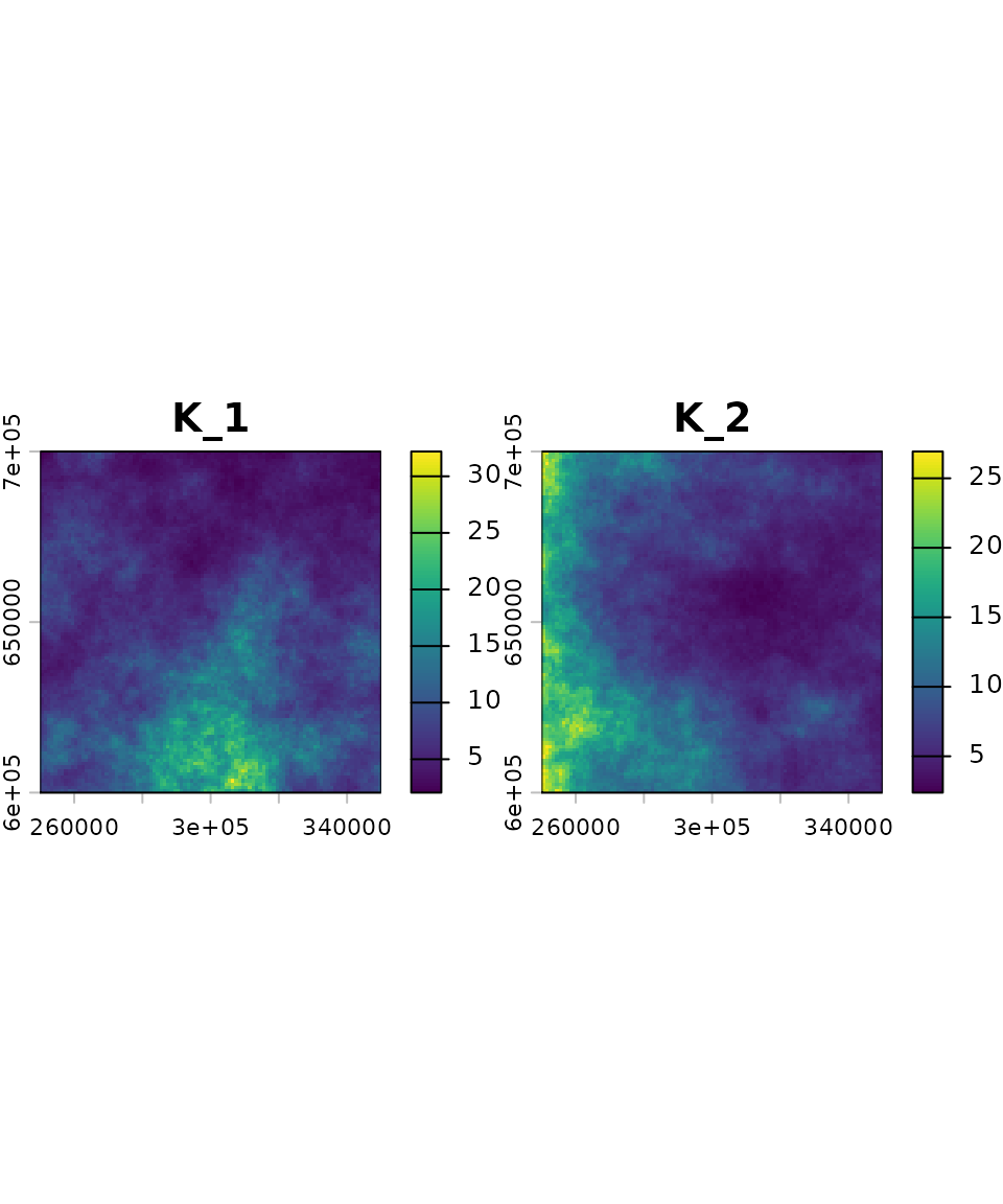 K_map <- K_sim(n = nspec, id, range = 5e5, qfun = qlnorm, meanlog = 2, sdlog = 0.5)We generated a raster with two layers. Each layer represents the carrying capacity map for a given virtual species. In this example, the carrying capacity maps were generated using a log-normal distribution; however, any distribution can be used by specifying the appropriate quantile function.
