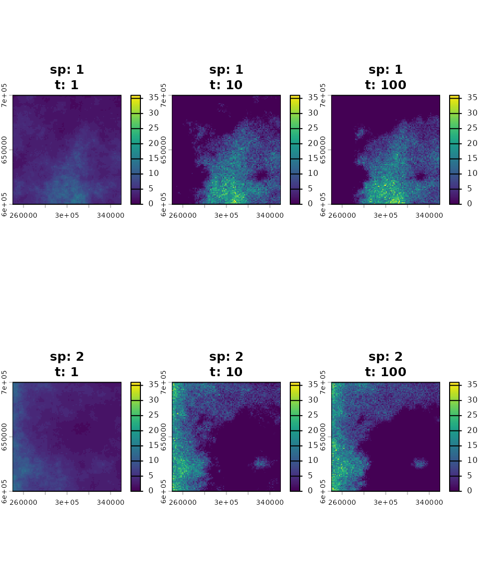 n1_mapis aSpatRasterobject specifying the initial abundance of species (in this example, set to half of the carrying capacity). - The